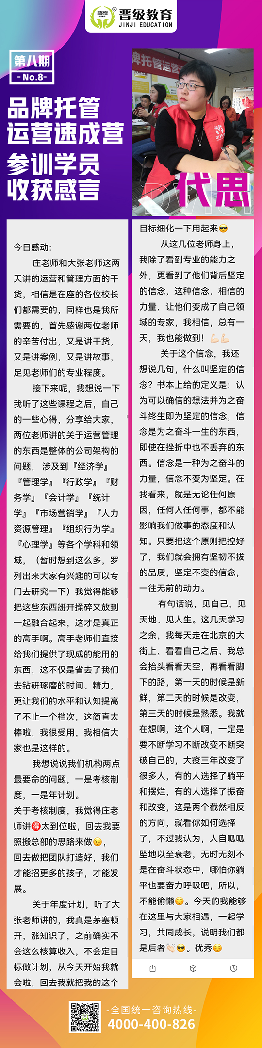 此次第八期《品牌托管速成营》还剩最后1天,通过前些天的课程,学员们在晋级专家讲师的带领下,共同提升,收获满满,参会校长和老师们更加坚定了做好中托盟,跟着晋级走的意志和决心!