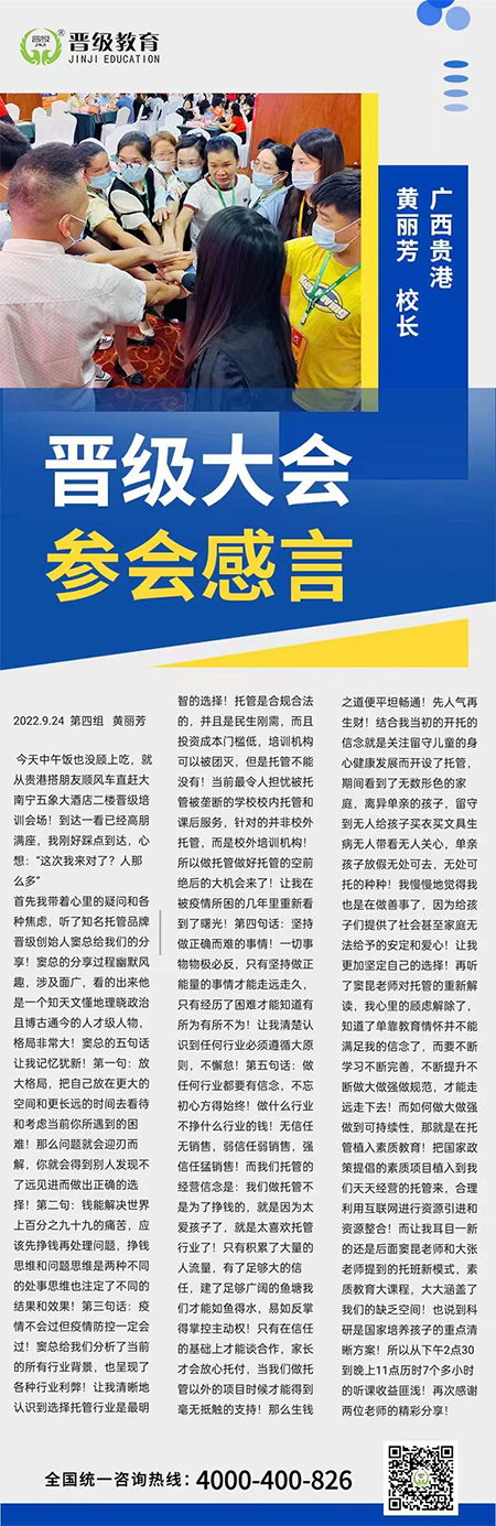 “今天接触到了很多新鲜的观念,我在江苏扬州有一个培训机构,现在想整装重新出发,10年前我就在做托管了,但那个时候市场和现在不同,政策也和现在不一样,当时没有经验,有新手光环,觉得做的还算顺利,但后来开始面临职业的天花板和瓶颈,规模做不大,缺乏系统化,一个人单打独斗,没有管理团队的能力,想要走远,还是得依靠团队的配合。今天学到了晋级教育的招生模式、课程模式……这些都不是一个单独的机构能够做到的,这种成熟的模式可以拷贝到任何地区。当时19年我们的校区规模各方面都达不到要求,只能被迫停下。21年又面临双减,整个市场和行业都发生了巨大的变化,现在要想重新出发,没有分析,没有规划,我会觉得底气不足,那么大的投入,万一又有新的政策对行业造成致命伤害,我还输得起吗。我认为对于刚加入托管行业的人,有晋级教育的帮助,可谓事半功倍,通过他们的分析,能让你避免踩坑。之前在做托管的时候,就曾经被邀请过来学习,今天终于能够在线下见面,我觉得学到了很多,晋级教育有很多好点子,我们可以在他们的基础上,借用他们的模式,做你自己有个性化的东西。”