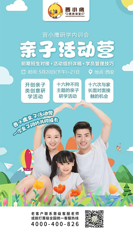 晋小鹰亲子活动,是晋级托管学堂为了帮助“双减”后的教培机构进行创新,提升机构竞争力而推出的一项亲子活动。既能丰富校区活动,增添校区特色,同时又能助力校区提升家校粘合度,实现理想化的家校共育,给校区提供一次生源爆满的机会。