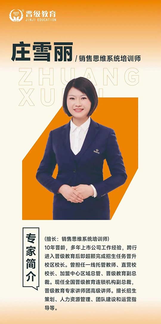庄雪丽,曾在上市公司工作多年,跨行进入晋级教育,至今已有十年,从一线托管教师做起,因在直营校区招生排名遥遥领先,后晋升校区长、加盟中心区域总管,现任全国晋级教育连锁机构副总裁,晋级教育专家讲师团高级讲师。2020年,晋级在深圳战略性成立深圳分公司,庄雪丽被公司任命负责深圳分公司,一切从零开始。而她本人非常擅长招生策划、人力资源管理、团队建设和校区运营指导。