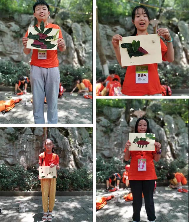 午饭前,晋级老师组织孩子们制作树叶画,顾名思义,就是将各种树叶放在一张纸上成为一幅画。孩子们发挥他们的奇思妙想,个个脑洞大开,几片不起眼的树叶在画纸上竟成了富有新意的画作,几片树叶摆出了不同的形状,各有千秋。
