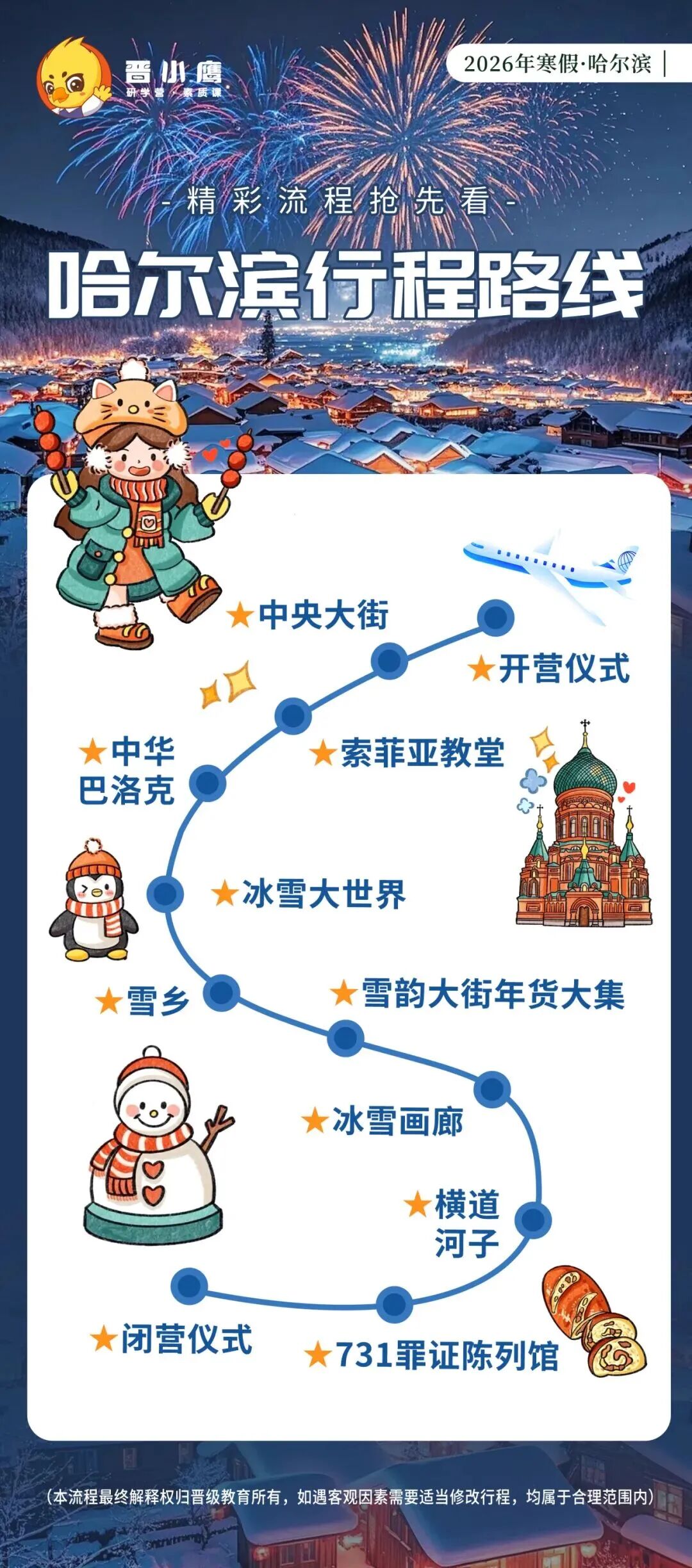 晋小鹰快乐学习动力营哈尔滨站,秉承 “跟着课本去旅行” 的核心研学理念,将城市变为课堂,让冰雪成为教材。
