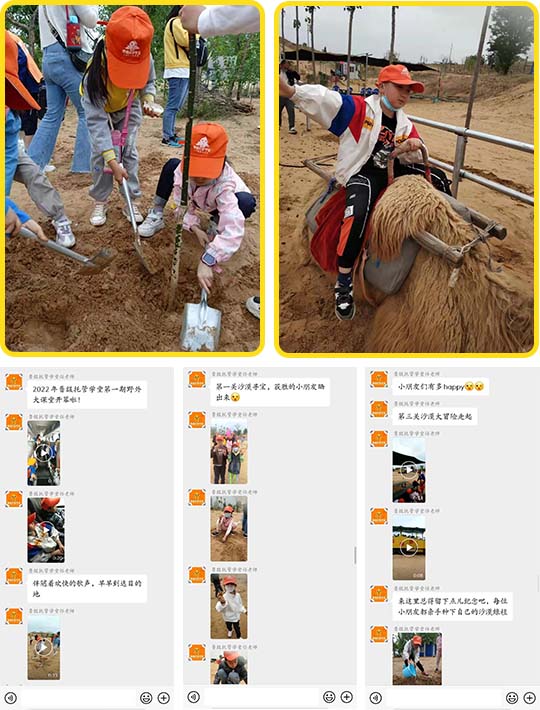 组织学生开展野外大课堂活动,植树,挖沙,骑骆驼,拉弓射箭,孩子们别提多开心了,这就是学中玩,玩中学,孩子喜欢,家长满意的教育模式。