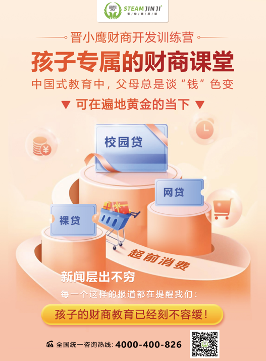晋小鹰财商开发训练营,是由晋级教育旗下深耕小学教育十年以上的专家团队研发而成的,适合6-12岁小学生学习的少儿财商开发课程。